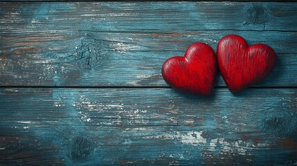 Valentines day background with two red hearts on wooden background.