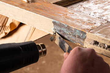 Vintage window restoration, worker using putty knife and electric heat gun to remove old paint
