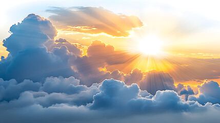 Heavenly sunlight breaking through fluffy clouds in a dramatic display , sunlight, heavenly, breaking through, clouds, dramatic