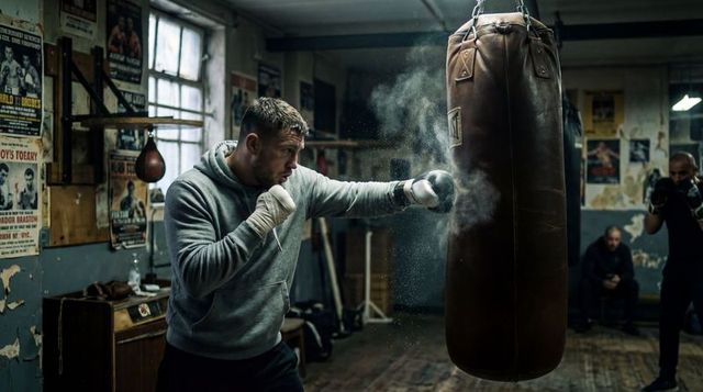 Muscular boxer training on heavy bag under dramatic gym lighting, intense focus