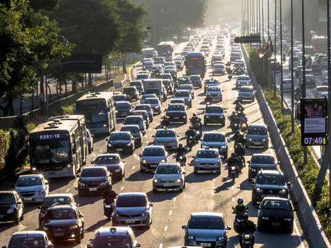 Sao Paulo, SP, Brazil, June 12, 2018. Traffic jam on 23 de Maio avenue, both directions, south of Sao Paulo,