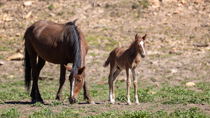 Wild horse baby colt with mother in the Apache Sitgreaves National Forest mountains in Heber Arizona United States