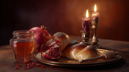 Rosh Hashanah, jewish religious festival, table with pomegranate, challah bread and honey jar