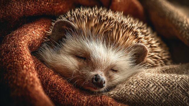 An endearing hedgehog curled up tightly asleep amidst soft bedding exotic pet