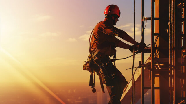 A working at height equipment, Construction worker wearing safety gear working at construction site.