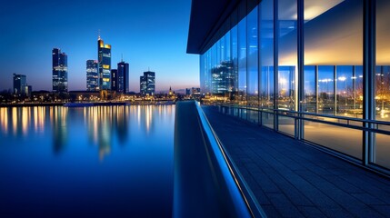 cityscape twilight view, asphalt observation deck, soaring glass towers, electric blue lighting, modern urban development, architectural height variation, dark midnight ambiance, corporate building