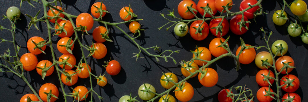 Ripening kaleidoscope of cherry tomatoes, summer solstice garden festival, vibrant salads, heirloom varieties' mosaic, evocative culinary story