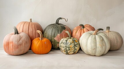 Colorful assortment of heirloom pumpkins and gourds in various sizes, shapes, and pastel colors creating a festive autumn harvest display.
