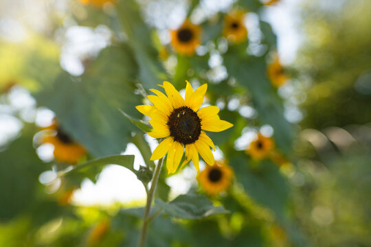 Bokeh filled yellow and green sunflower garden field at sunrise