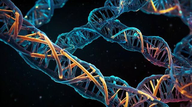 Close-up of intricate double helix structures representing ancient DNA molecules, highlighting the complexity and historical significance of genetic material, with copy space for text or design.