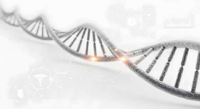 Illuminated DNA strand helix against a deep blue gradient background, scientific and technological advancement representation, digital artwork.