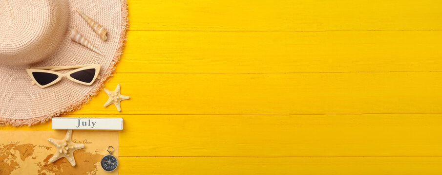 Beach accessories, map and compass on yellow wooden background with space for text