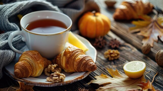 Autumn tea with leaves, croissants, lemon, and walnuts. Cozy morning. Thanksgiving at home. Warm routine.
