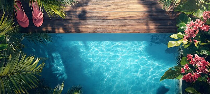 Trendy sandals on a poolside deck, tropical background with copy space around