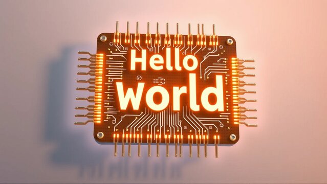 Motherboard Circuits Displaying 'HELLO WORLD', Programming and Coding Concepts