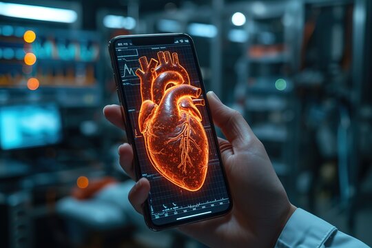 Doctor using mobile phone diagnosing patient heart for disease, technology display assistance holographic AI, healthcare medical staff in hospital treating ill people, health examine portable device