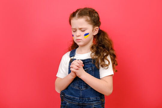A young caucasian blonde woman prays with her eyes closed and folded hands asking help, rescue, peace isolated on a background of the Ukrainian flag