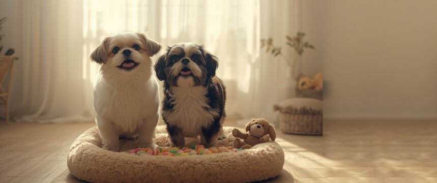 Sweet treats for cute pets. Morning scene with Shishu dogs inside the house. Black and white dogs standing around.