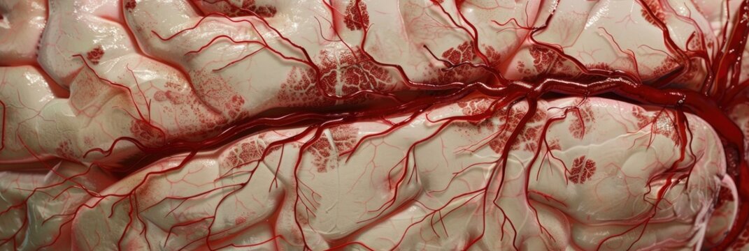 Close up of brain surface displaying leptomeningeal blood vessels with moderate congestion and scattered subarachnoid hemorrhages on the left side