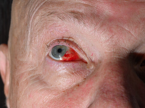 Subconjunctival hemorrhage, open red eye of an elderly man