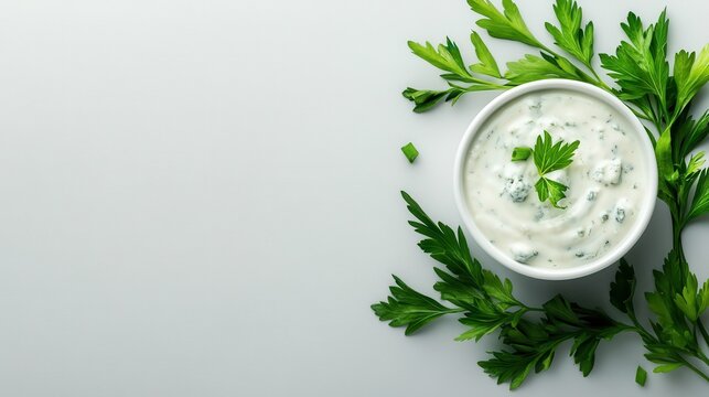 Bowl of sour cream dip sauce with herbs isolated on white background, top view