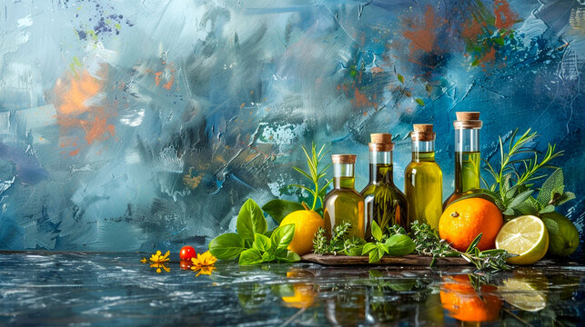 Healthconscious oil and herb selections positioned on a reflective surface with a dynamic abstract art backdrop