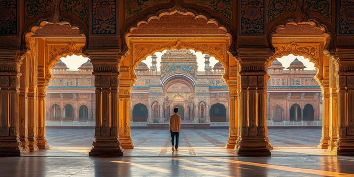 Grand palace corridor with intricate arches and columns
