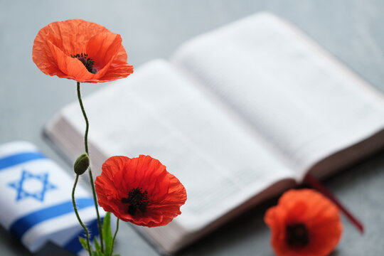 Bright orange poppies placed near an open book on a dark surface, Israeli flag a symbol of remembrance and hope. War memorial holiday. Jewish Remembrance Days