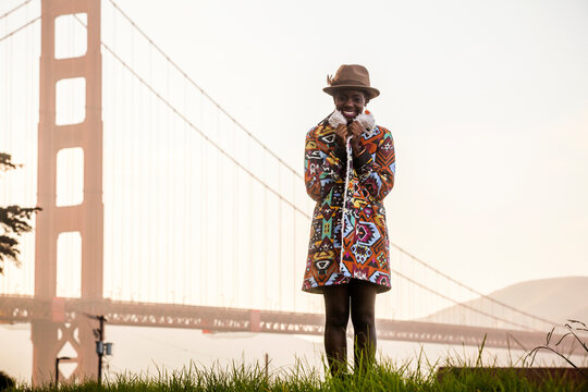 Black woman wearing colorful coat by Golden Gate Bridge, San Francisco, California, United States