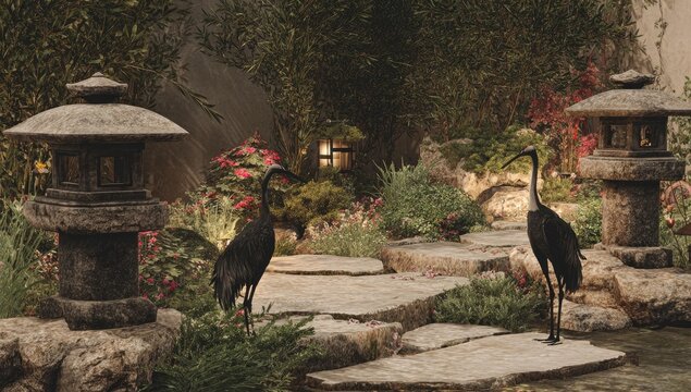 Serene Japanese Garden with Crane Statues and Stone Lanterns.