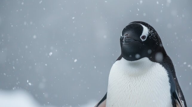 A serene penguin appears unfazed by the gentle snowfall around it, imbuing a sense of peacefulness and resilience