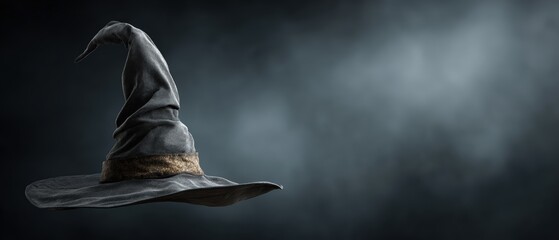 Vintage black witch hat with pointed tip and wide brim against dark moody background for Halloween costume