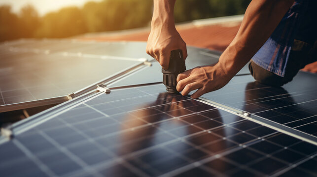 A technician is securely mounting photovoltaic solar panels on a house roof, using a hex key and illustrating the notion of eco-friendly energy.