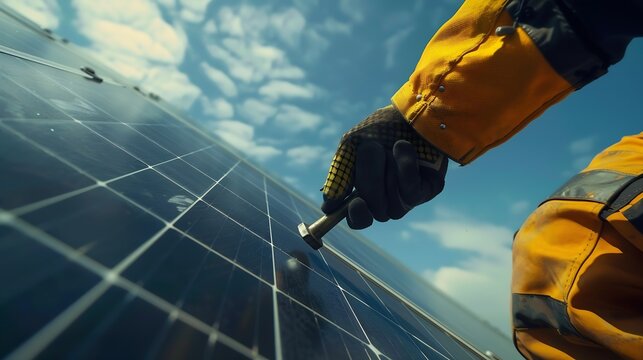 Close up of worker hand in glove holding a hex key installing photovoltaic solar panel with blue sky on background Electrician mounting solar photovoltaic panel system Concept of alter : Generative AI