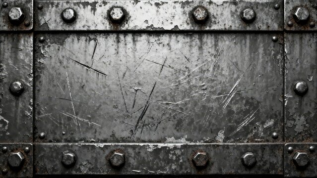 Heavily scratched metallic steel panel texture featuring worn surface damage and surrounding industrial hex bolts and rivets.