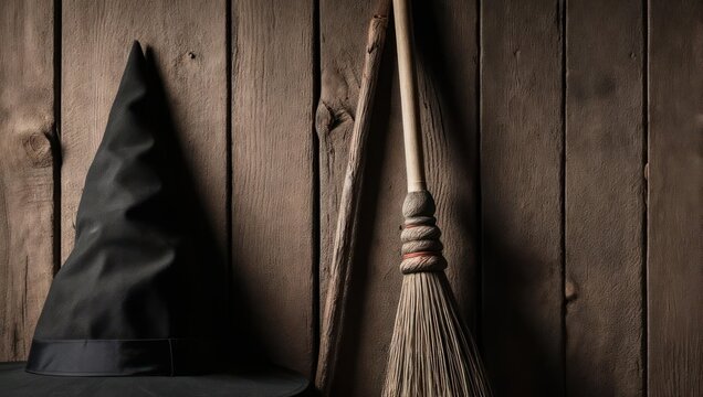 Witchs Hat and Broom Leaning Against Wooden Wall for Halloween.
