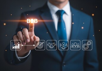 High-level business strategy concept showing user interaction with digital icons on a virtual screen, representing teamwork, partnership, innovation, technology, target setting, growth planning, and b