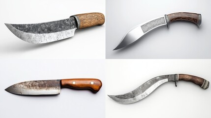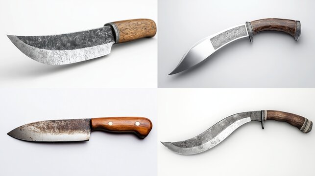 Four handcrafted knives with varying blade shapes, sizes, and finishes; two feature a rustic, aged look, while the other two showcase a more polished