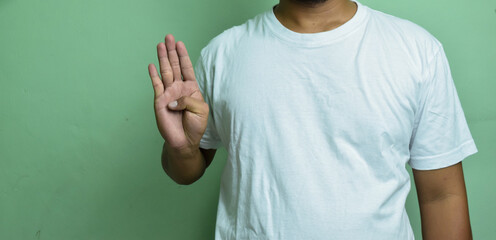 young man learning deaf alphabet and forming letter B with raised hand