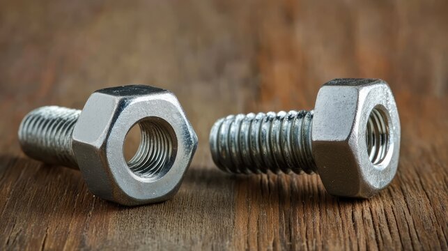 Hexagon head bolt and nut on wooden surface showcasing metallic texture and construction hardware details