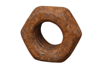 Rusty hexagon nut showing metal corrosion and weathering, construction hardware against transparent background