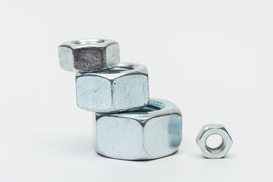 Group of silver metal nuts isolated on a white background. Large metal nuts.