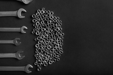 Silver wrench and nut against white tools for repair, construction, fixing