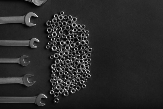 Wrench, hex bolt and hex nut on leather floor.