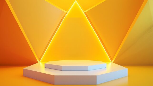 A geometric backdrop featuring vibrant orange and yellow tones illuminates a white hexagonal pedestal, creating a striking and modern display at sunset.