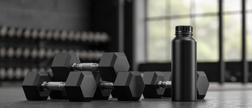 Black dumbbells and water bottle in a gym