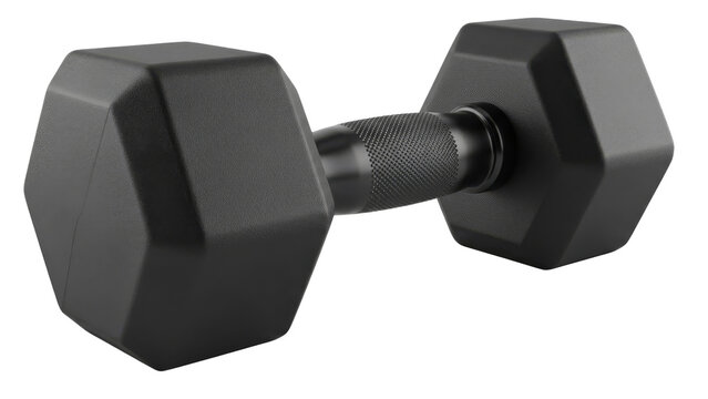 Heavy black hexagonal dumbbell for strength training and intense workout isolated on transparent background