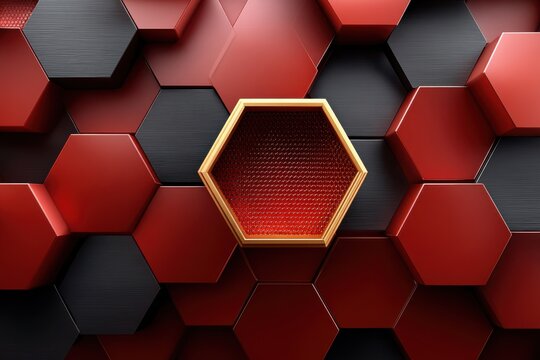 Red hexagonal 3D background with honeycomb pattern and gold framed center hexagon