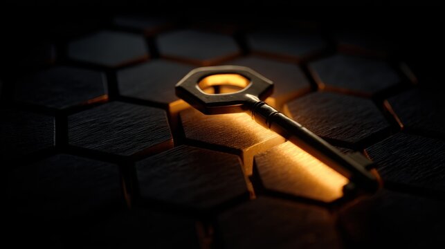 A vintage key with a hexagonal shape, lying on a hexagonal grid with a warm, golden light shining through it, casting a shadow on the surface below.