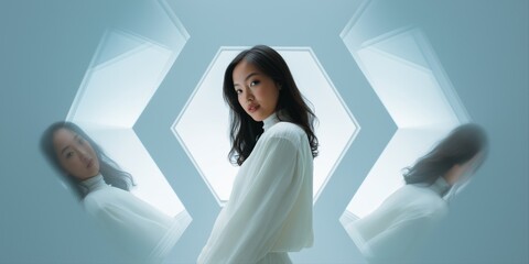 Abstract interior with geometric mirrors on an isolated background. Hexagonal mirrors, fashionable composition in the interior